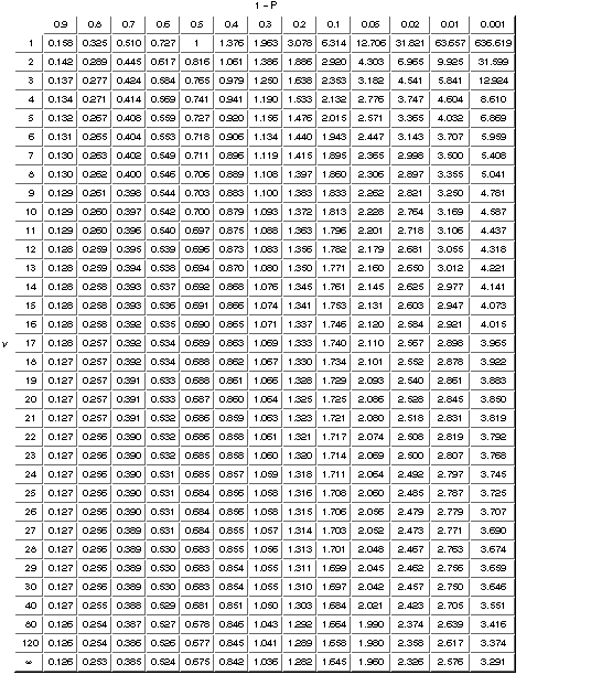 Table des valeurs critiques du test de t